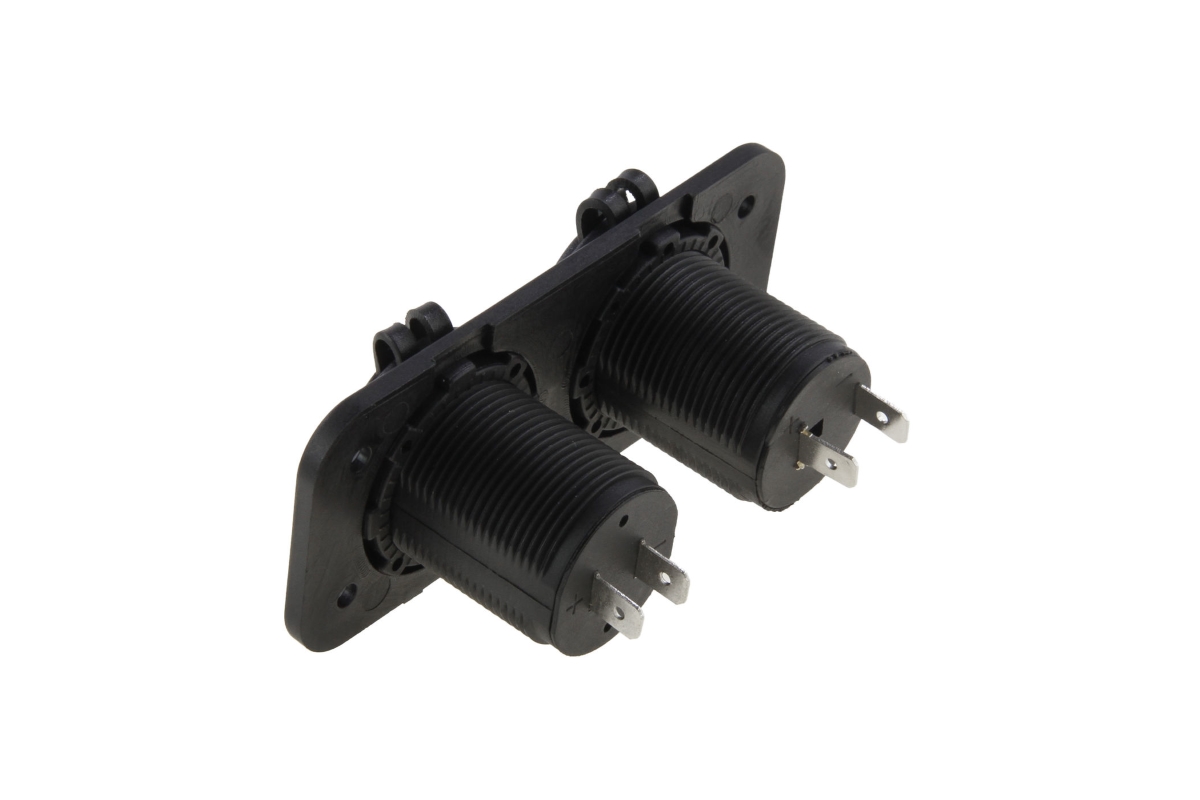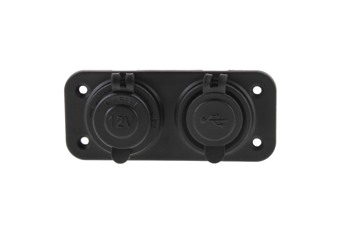 Панель с прикуривателем и USB-разъемом с двумя портами выполнена из ударопрочной пластмассы. Служит для питания и зарядки электронных гаджетов. Оба разъема защищены резиновыми герметичными крышками.