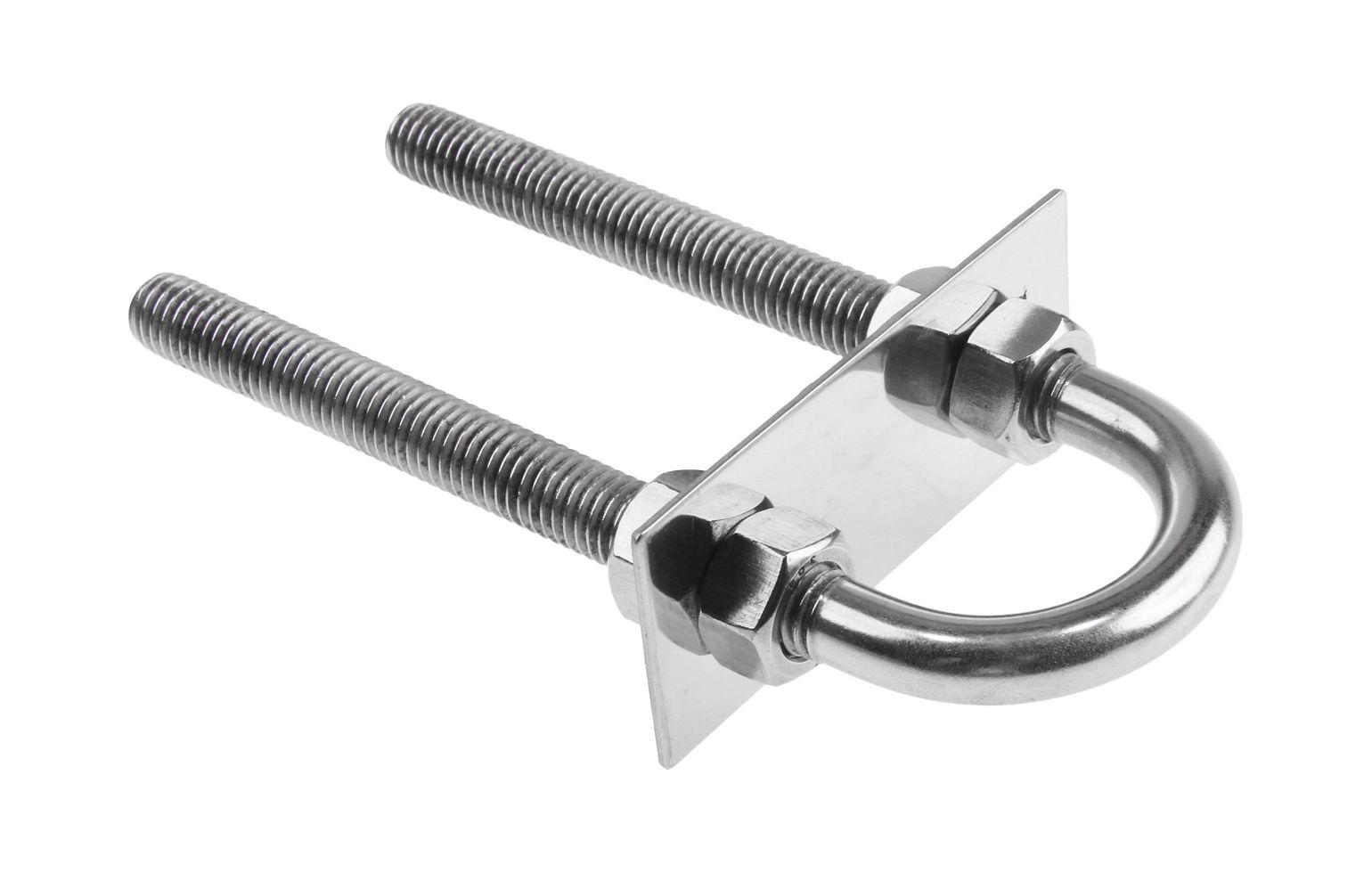 Рым-болт U-образный с крепежными пластинами. Применяется для крепления цепей, тросов, веревок, а также для подъема грузов во время такелажных работ. Выполнен из нержавеющей стали.
