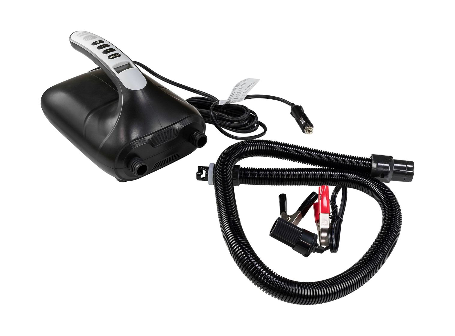 Двухступенчатый лодочный насос Marine Rocket быстро наполняет объём и докачивает до требуемого давления (очень усредненно на судно 360 см уходит около 12 минут). Углы пластикового корпуса максимально сглажены; при необходимости удобно держать устройство на весу за ручку. На ней же размещены цифровой дисплей с подсветкой и всё управление. Питается агрегат от сети 12 В через разъём прикуривателя с предохранителем 20 А. Если прикуривателя нет или аккумулятор ближе, — используйте «крокодилы» из комплекта! Шаг настройки — 35 миллибар (шкала в барах или PSI). Максимальное значение датчика — 1,37 бар (20 PSI). Это приблизительно в 4 раза выше паспортного давления в баллонах обычной лодки ПВХ. Длина гофрированного пластикового шланга — 1 метр. Гофрированный пластиковый шланг накручивается на резьбу штуцером, сам при этом не вращается (это весьма удобно). AP 020 может работать как в режиме накачивания, так и активного спускания воздуха. Просто поменяйте порт на противоположный. Когда вы задались целью сложить лодку максимально компактно, режим откачивания очень пригодится: «шкура» без особого труда войдёт в штатную сумку для переноски. Лодка накачивается в два этапа. Начинает работу первая ступень вентилятора, создающая объём. Затем насос автоматически переключается на поршневой компрессор и доводит давление в изделии до выставленного на задатчике. Изделие легко разобрать, чтобы при необходимости получить доступ к его агрегатам. Внутри — два насоса, каждый с персональным электродвигателем. Центробежный вентилятор выполнен из металла. Значит, надёжный. Контакты пропаяны качественно, сечение провода соразмерно нагрузке на мотор. При долгом накачивании устройство может сильно греться. Поэтому производитель предусмотрел паузы после каждых 15 минут интенсивной работы. Дайте аппарату остыть.Характеристики модели «Насос электрический высокого давления AP-020, Marine Rocket»