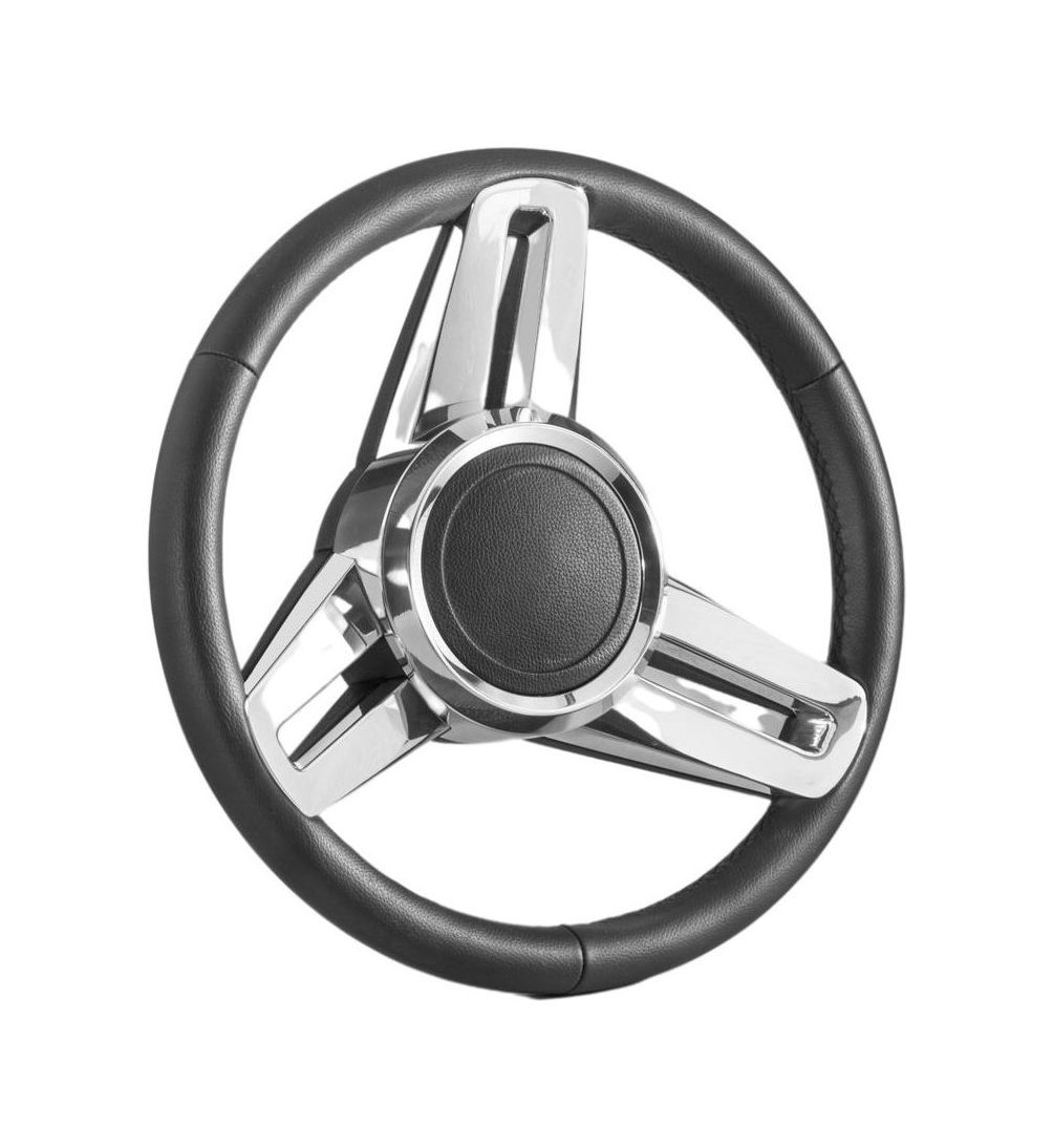Рулевое колесо DAPONTE с диаметром 35 см, обод обшит черной натуральной кожей. Спицы из полированной нержавеющей стали. Накладка колеса покрыта черной кожей.